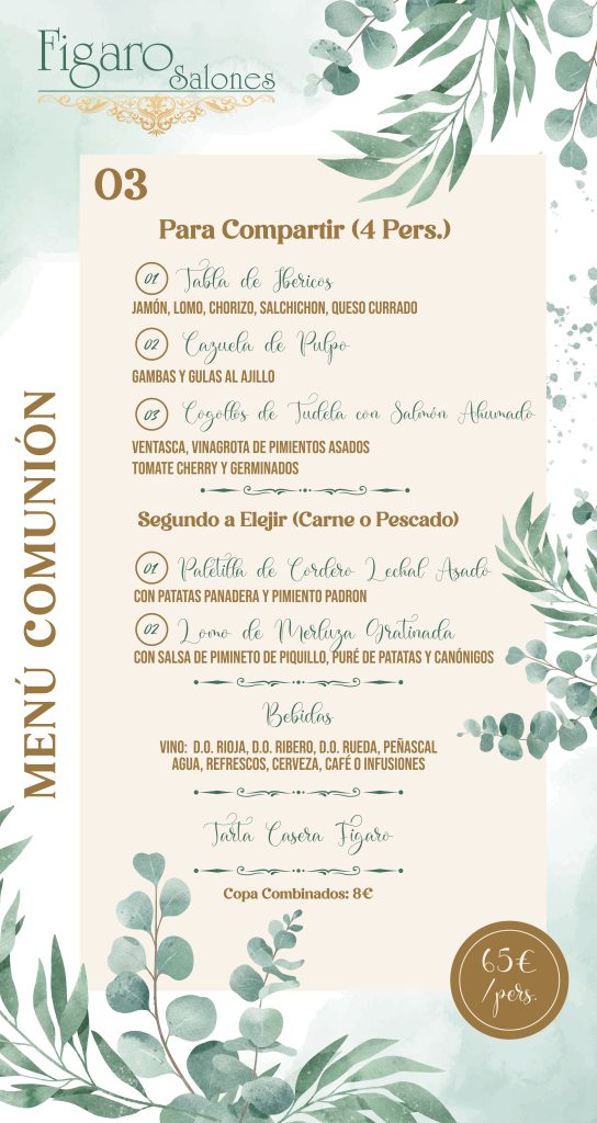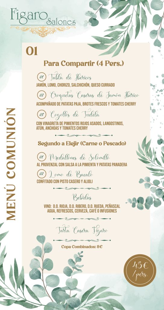 Cada menú combina platos elaborados, ingredientes de calidad y una presentación elegante para que la celebración sea perfecta de principio a fin. Opciones variadas, pensadas para todos los gustos, y un ambiente acogedor que hará que ese día tan importante se convierta en un recuerdo inolvidable.